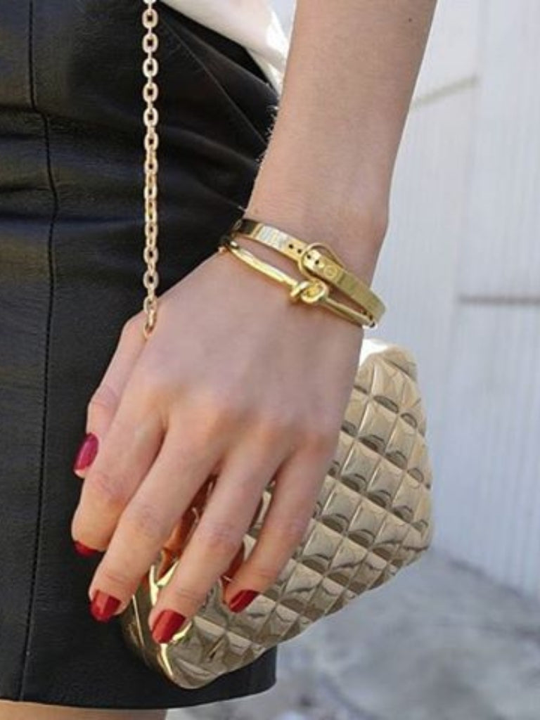 A lustrous finish and classic buckle closure offer traditional beauty, while chic industrial screw details lend an edgy flair to this piece.