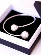 The perfect complement to any classic look, this bangle boasts a high-shine finish with two pearl accents of slightly different sizes, adding a distinctive touch of elegance.