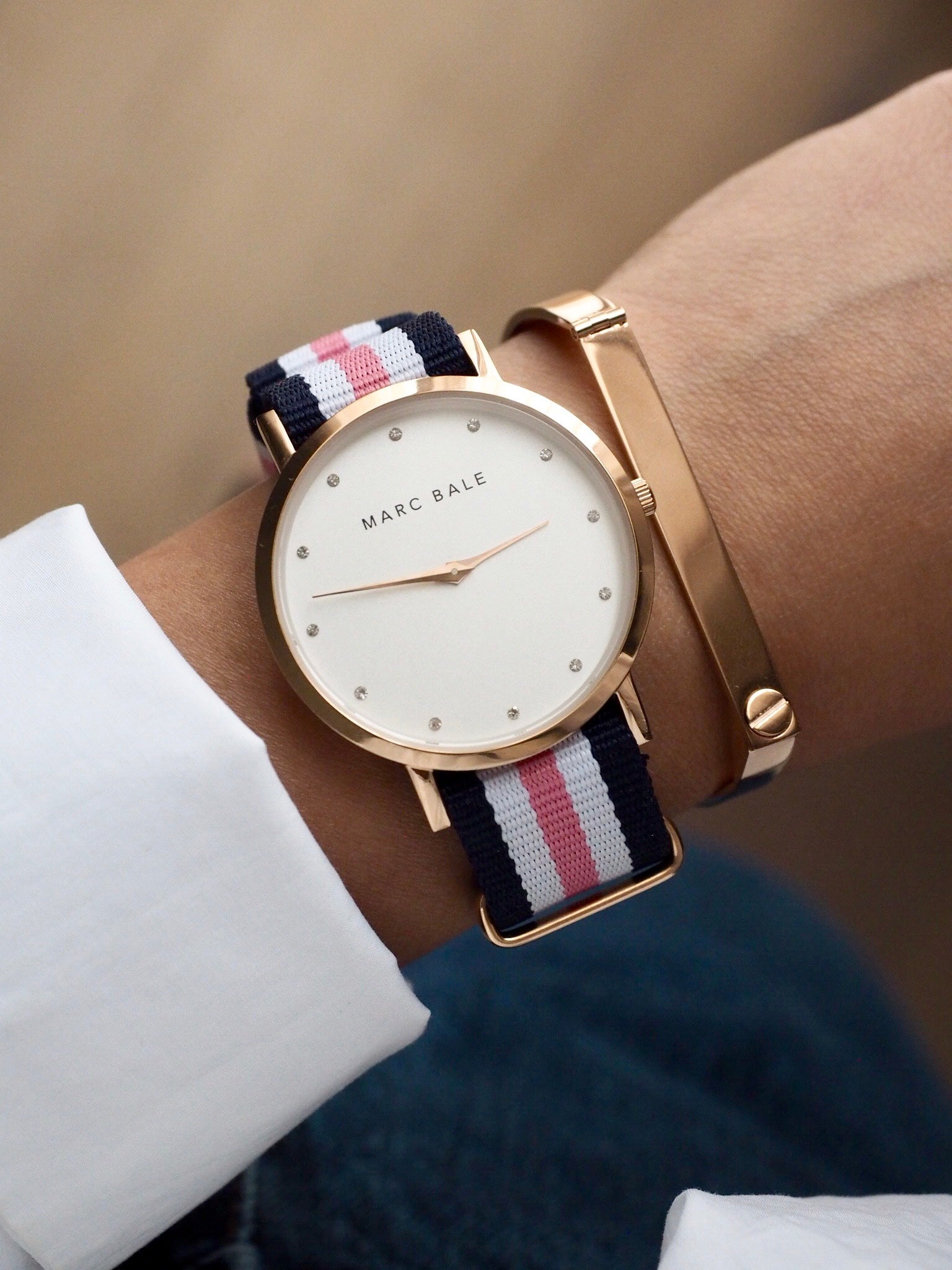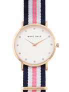 The Brillance Classique Allure comes with an interchangeable blue, white, and pink NATO strap, adding a vibrant touch to its classic design.