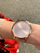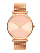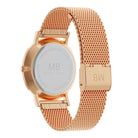 The watch is crafted with a refined rose gold-plated stainless steel case, combining sophistication with lasting durability.
