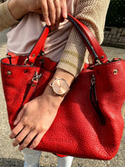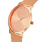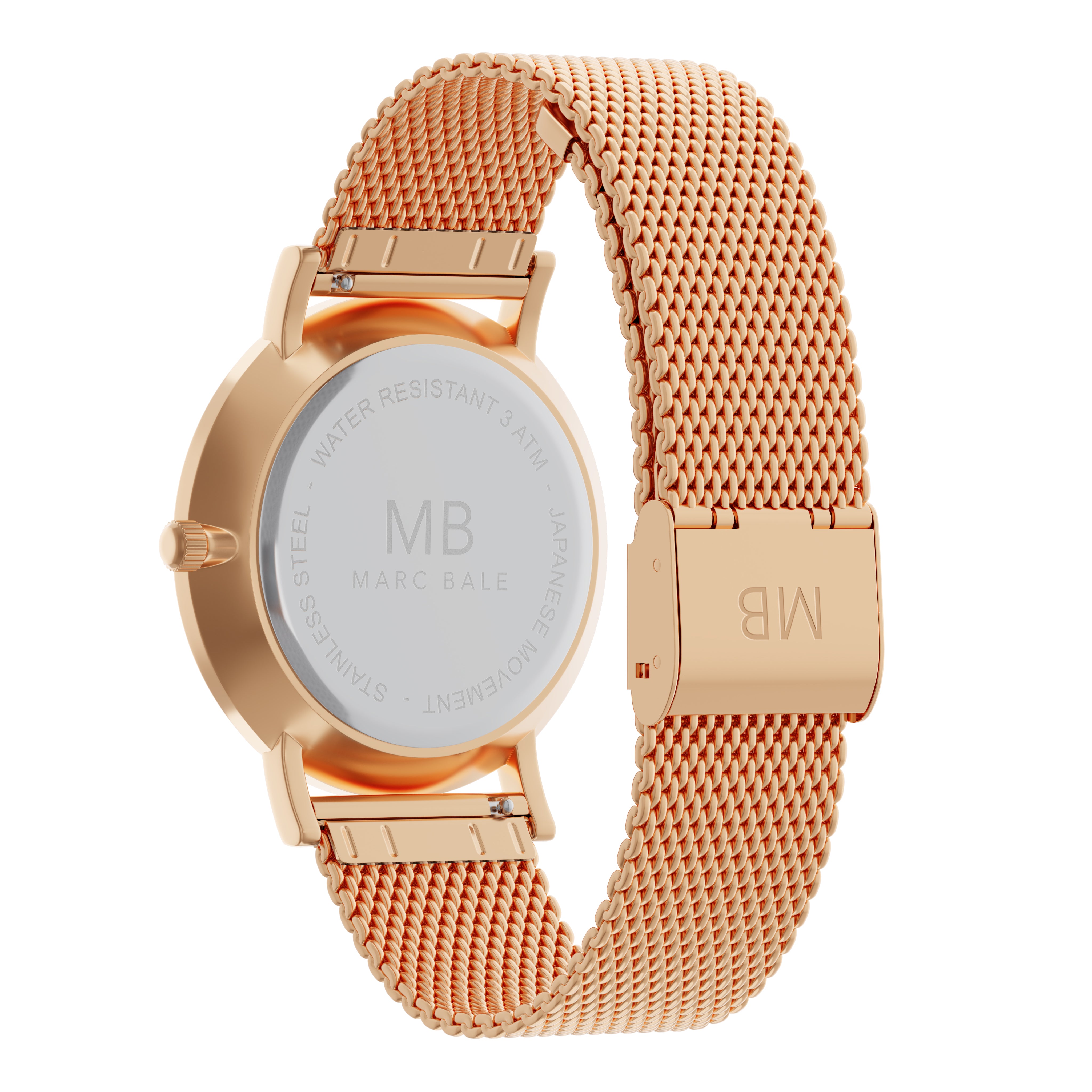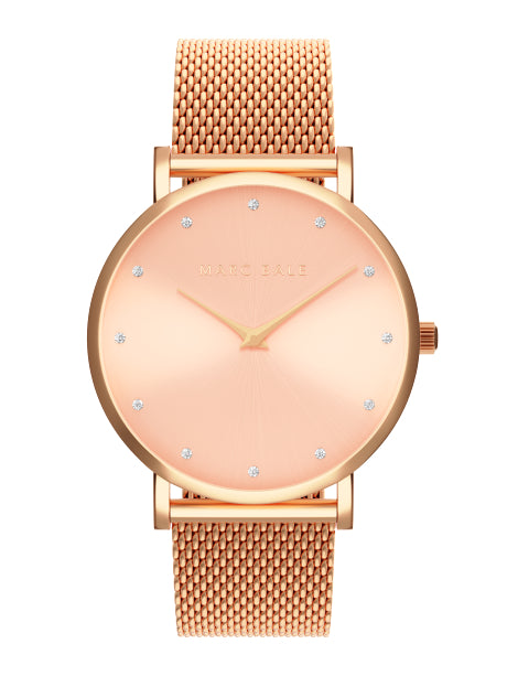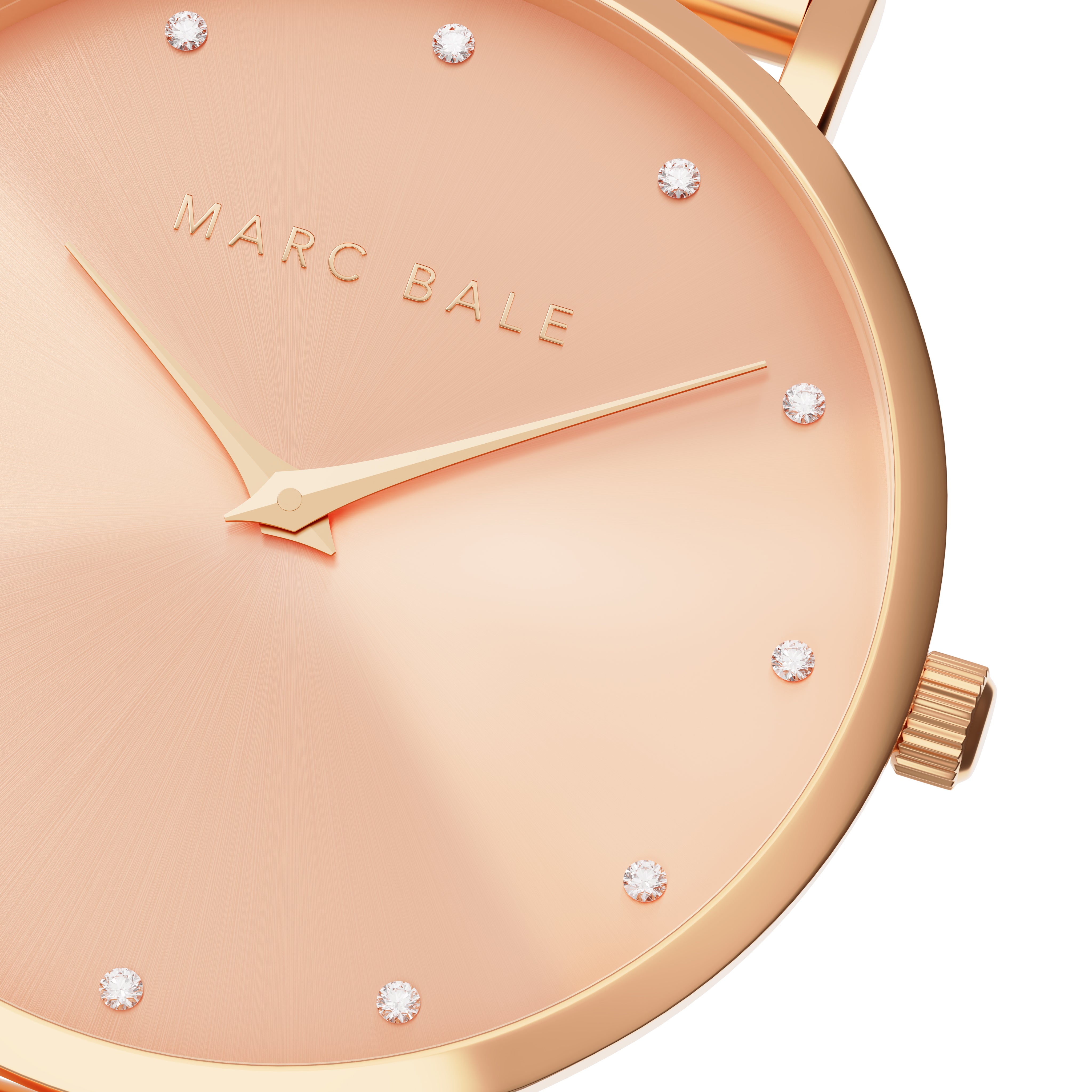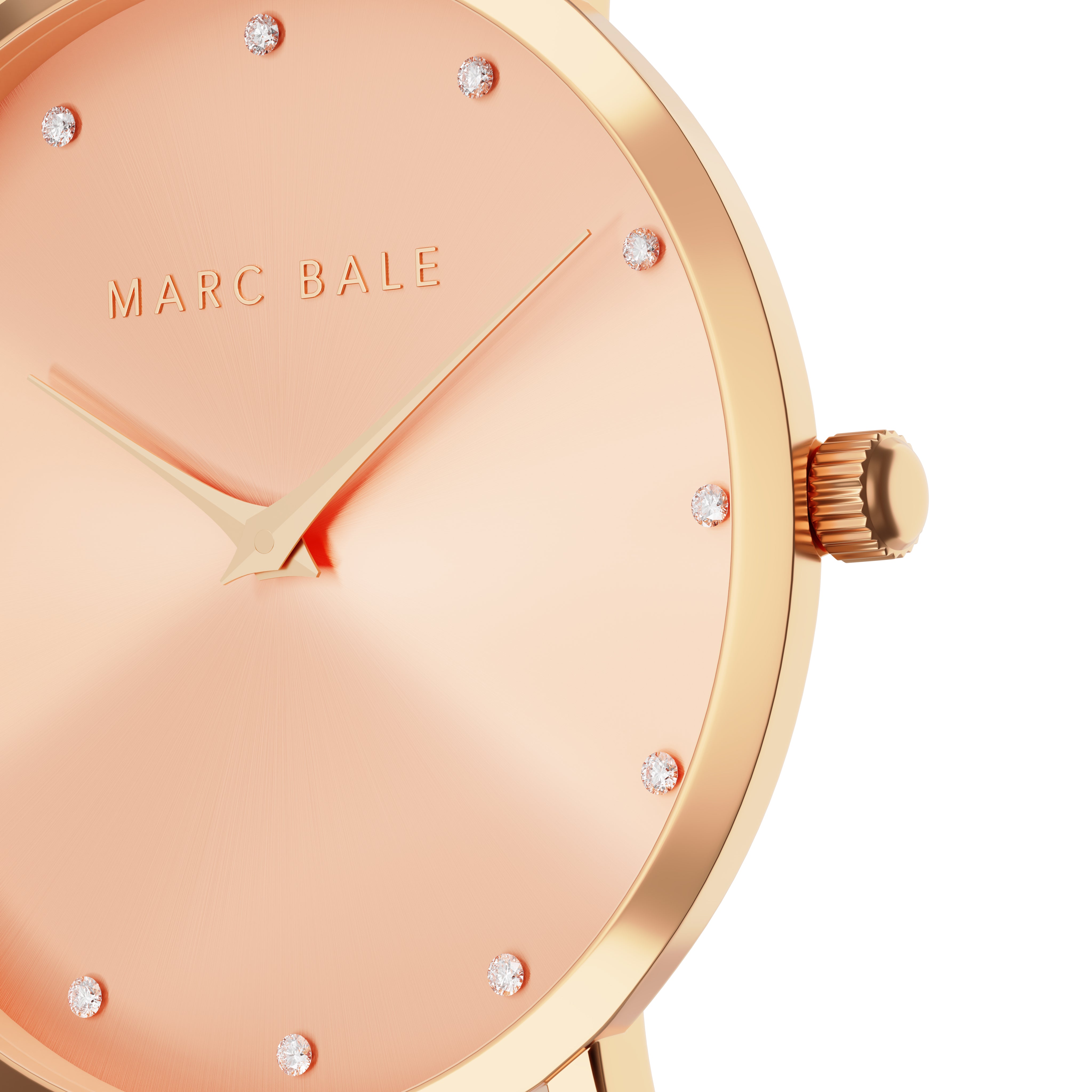 The Brillance Classique Unitone watch by Marc Bale features a striking sunray rose gold dial adorned with radiant Swarovski crystals. This exclusive design enhances our signature large twelve-index dial, giving it a warm and luminous appearance, making it suitable for both daily wear and formal occasions.