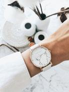 At the heart of the Gaia Lumière is its genuine white marble dial, accentuated with subtle grey veins that make each watch uniquely beautiful. The natural patterns of the marble ensure that no two dials are alike, giving you a one-of-a-kind accessory.
