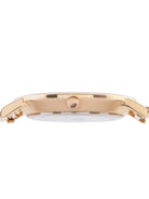 The watch is crafted with a refined rose gold-plated stainless steel case, combining sophistication with lasting durability.