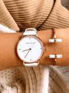 This stunning timepiece features a 34 mm rose gold case paired with a luxurious white genuine leather band, offering a chic and sophisticated style that transitions effortlessly from day to night.