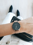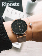The highlight of the Gaia Crépuscule is its genuine black marble dial, subtly veined with white. Each marble dial is one-of-a-kind, showcasing nature's unique patterns, making every watch truly distinctive. The deep, rich tones of the marble dial add a touch of mystery, perfectly balanced by the luminous rose gold elements.
