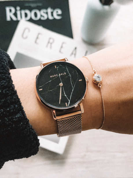 The watch is further refined with fine baton-style hands in rose gold, along with minimalist hour markers at the 12, 3, 6, and 9 positions. This minimalist design emphasizes the stunning black marble dial, creating a piece that is both sophisticated and eye-catching.