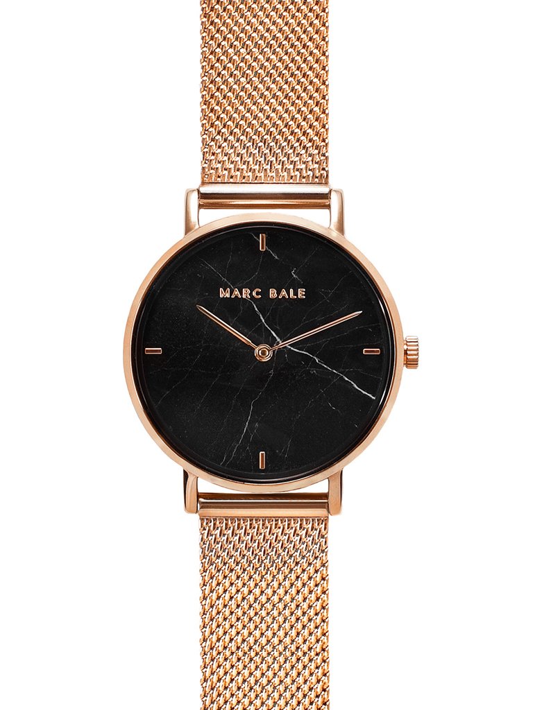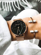 The watch is further refined with fine baton-style hands in rose gold, along with minimalist hour markers at the 12, 3, 6, and 9 positions. This minimalist design emphasizes the stunning black marble dial, creating a piece that is both sophisticated and eye-catching.