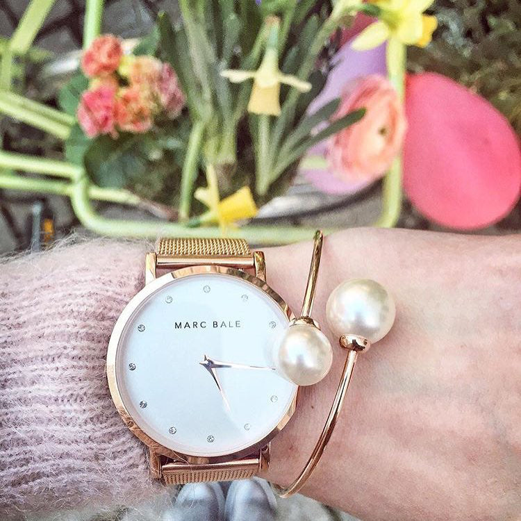 The Brillance Classique watch by Marc Bale features an elegantly adorned eggshell white dial with radiant Swarovski crystals. This exclusive design enhances our signature large twelve-index dial, giving it a fresh and luminous appearance, making it suitable for both daily wear and formal occasions.