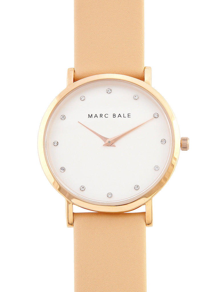 The Brillance Classique watch by Marc Bale features an elegantly adorned eggshell white dial with radiant Swarovski crystals. This exclusive design enhances our signature large twelve-index dial, giving it a fresh and luminous appearance, making it suitable for both daily wear and formal occasions.